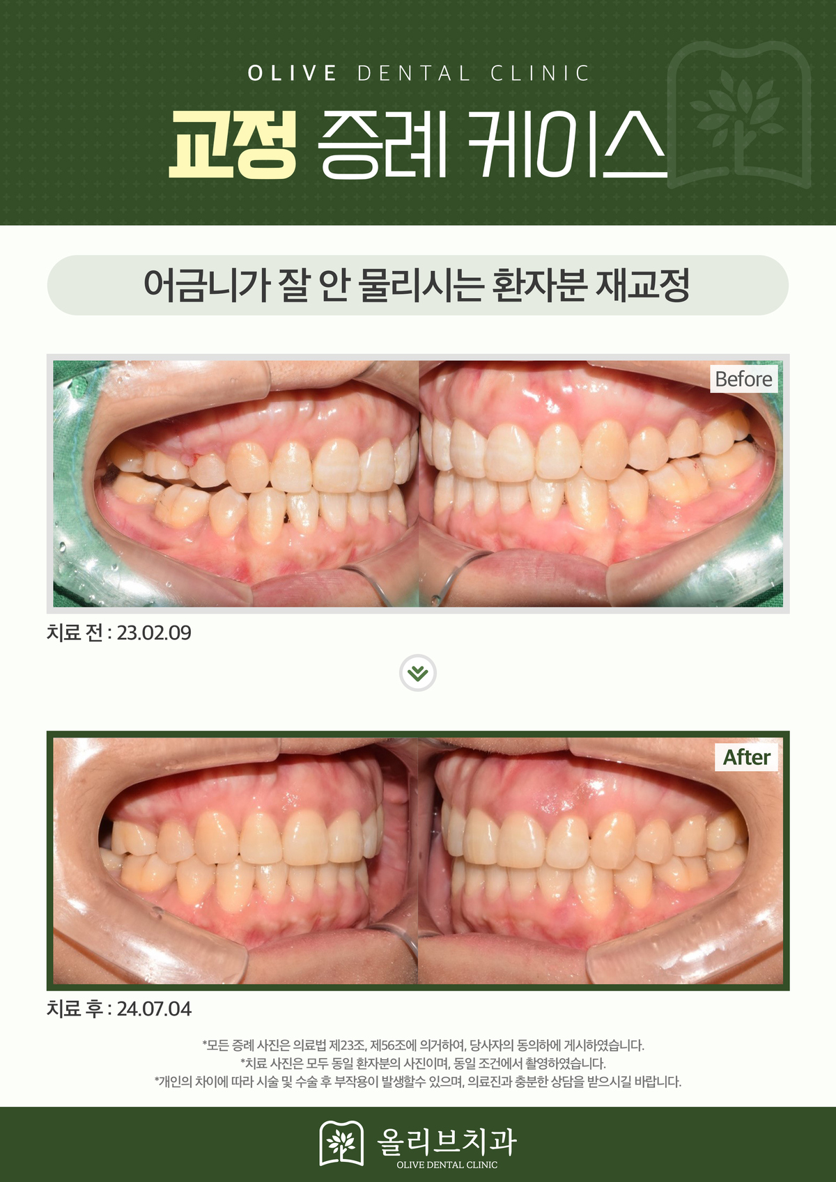 교정 증례 케이스 어금니가 잘 안 물리시는 환자분 재교정